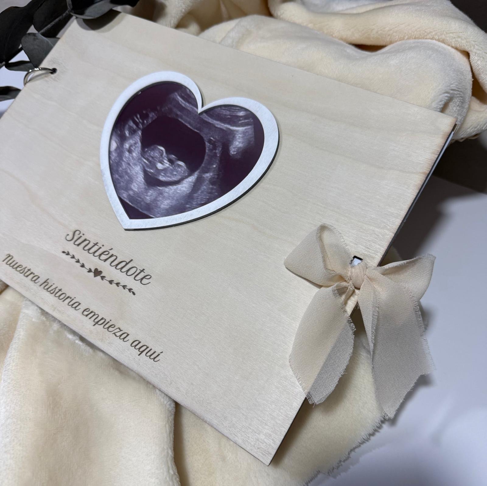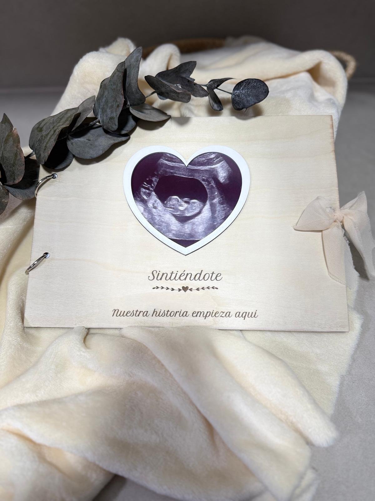 Álbum de fotos de madera natural diseñado especialmente para guardar y proteger las ecografías del bebé.