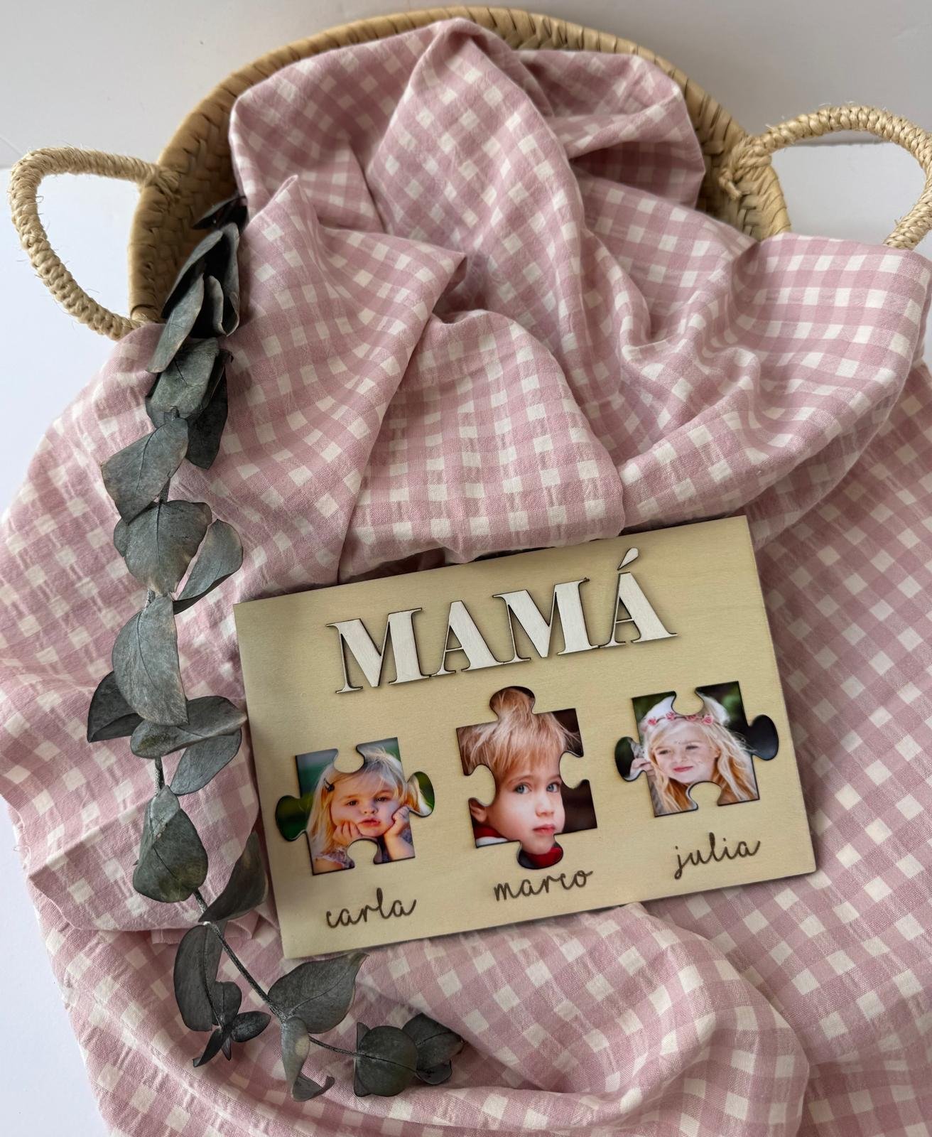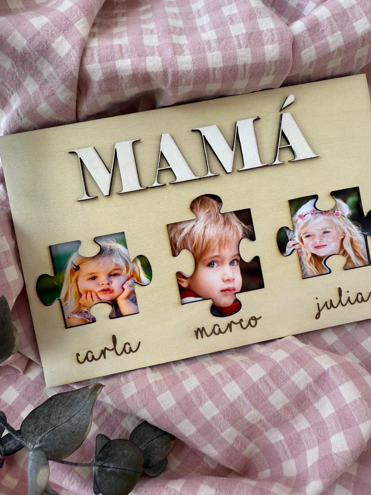 Un regalo único y lleno de significado para celebrar a quien siempre encaja todas las piezas con amor. Este marco de madera artesanal lleva la palabra «MAMÁ» pintada a mano en el centro, acompañada de 3 piezas de puzzle personalizadas con fotos de los hijos, simbolizando cómo cada uno forma parte de su corazón.